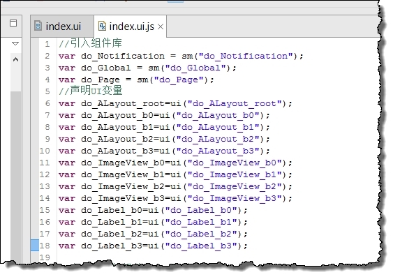有了頁面效果,接下來就需要使頁面動起來。雙擊index.ui.js進入代碼編輯頁,
