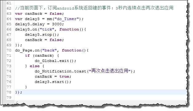 點擊android手機上的“返回”虛擬按鍵會觸發Page組件的back事件,所以我們訂閱back事件並在back事件裡處理返回還是退出。