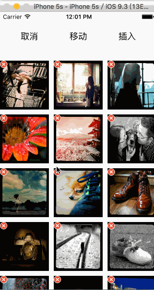 玩了幾天了,本來不打算寫的,還是寫下來留著自己以後可能會需要。本例是自己封裝一個collectionView,使用時只需要實例化並傳入數據源即可。就能進行相應的刪除,移動和插入操作。效果如下: