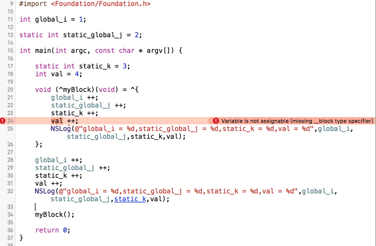 static_k ++;        NSLog(@"Block中 global_i = %d,static_global_j = %d,static_k = %d,val = %d",global_i,static_global_j,static_k,val);