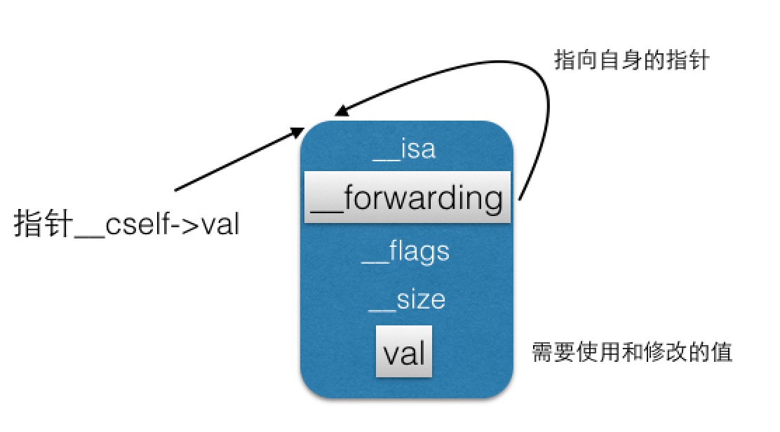 源碼中是這樣初始化的。__forwarding指針初始化傳遞的是自己的地址。然而這裡__forwarding指針真的永遠指向自己麼?我們來做一個實驗。