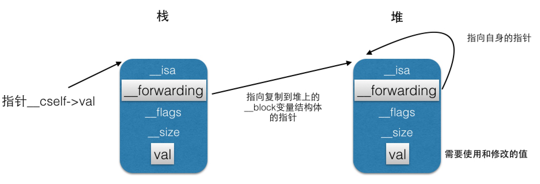 __forwarding指針這裡的作用就是針對堆的Block,把原來__forwarding指針指向自己,換成指向_NSConcreteMallocBlock上復制之後的__block自己。然後堆上的變量的__forwarding再指向自己。這樣不管__block怎麼復制到堆上,還是在棧上,都可以通過(i->__forwarding->i)來訪問到變量值。