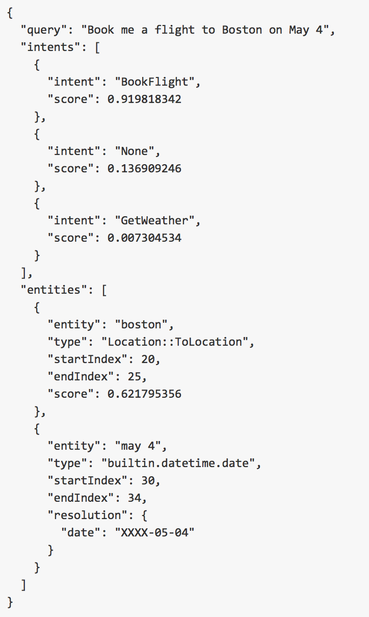 下面展示了一個意圖和分層實體的示例,語意分析結果采用JSON格式返回給調用者。