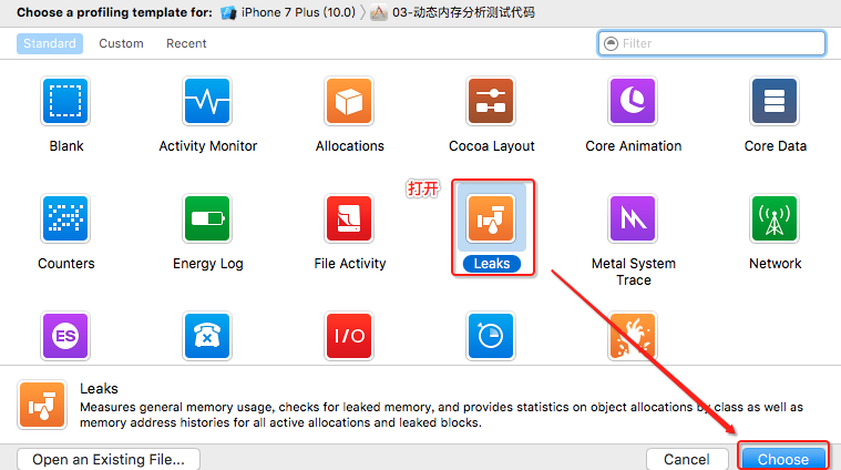 ② 點擊 Leaks 模板(圖中2區域), 可以查看內存洩露情況。如果在3區域有 紅X 出現, 則有內存洩露, 4區域則會顯示洩露的對象.