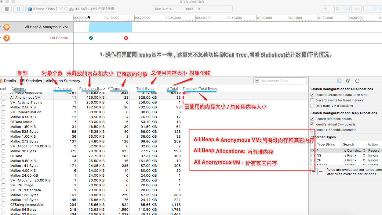 在 instruments 中,雖然選擇了 Leaks 模板,但默認情況下也會添加 Allocations 模板.基本上凡是內存分析都會使用 Allocations 模板, 它可以監控內存分布情況。① 選中 Allocations 模板,(圖1區域),右邊的3區域會顯示隨著時間的變化內存使用的折線圖,同時在4區域會顯示內存使用的詳細信息,以及對象分配情況.