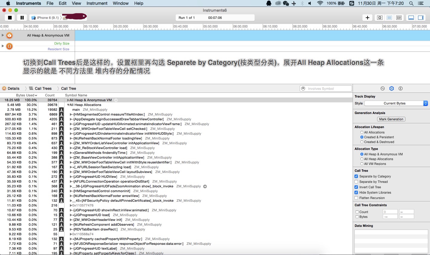 這裡使用 Analyze 靜態分析查找出來的洩漏點,稱之為"可疑洩漏點".之所以稱之為"可疑洩漏點",是因為這些點未必一定洩露,確認這些點是否洩露, 還要通過 Instruments 動態分析工具的 Leaks 和 Allocations 跟蹤模板. Analyze 靜態分析只是一個理論上的預測過程.3 > 動態監測Instruments的Leaks