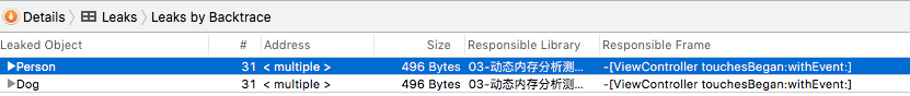 點擊洩露對象可以在(下圖)看到它們的內存地址, 占用字節, 所屬框架和響應方法等信息.打開擴展視圖, 可以看到右邊的跟蹤堆棧信息