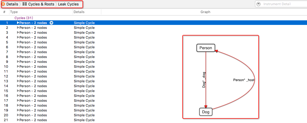 大的紅色矩形可以繪制對象引用環的圖,這裡如果是我們自己的東西,就能看出來各個對象之間的引用.