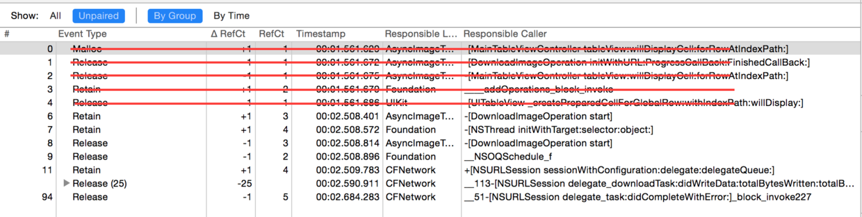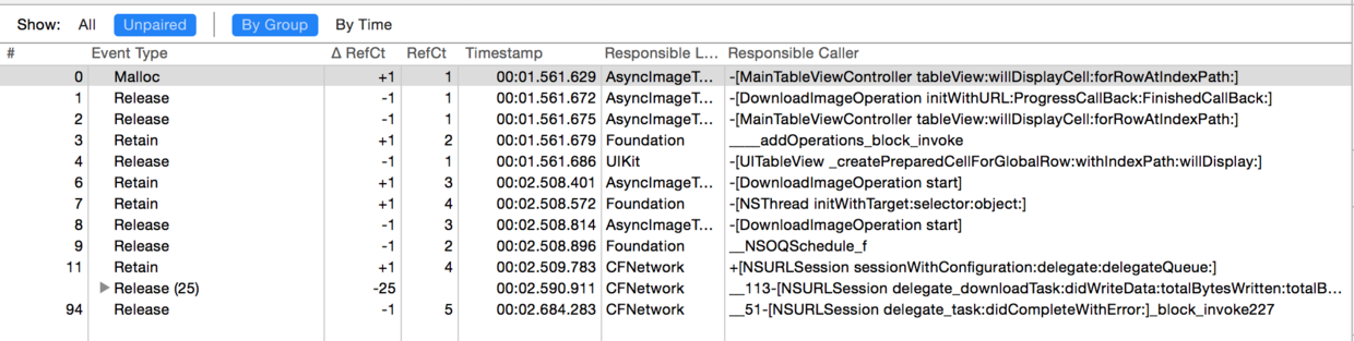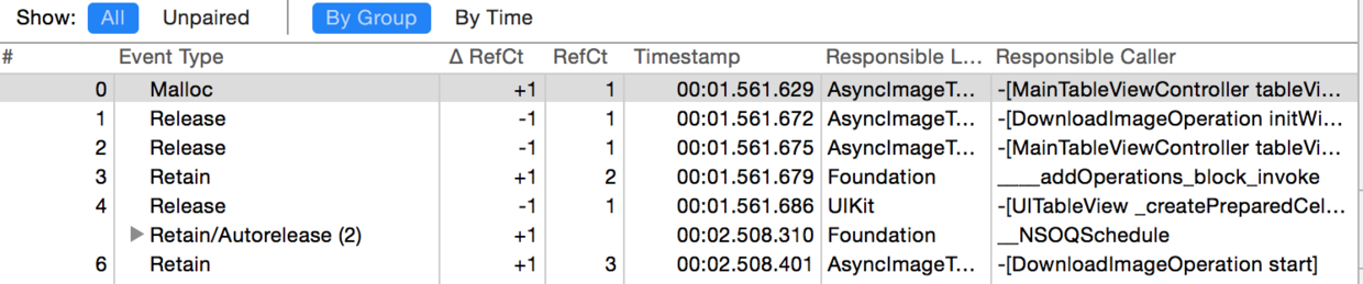 - All 表示所有的引用計數變化 - Unpaired表示那些為成對的變化``(成對就是leaks識別出了對應的+1,-1) - By Group會把相關的變化分成一組, - ByTime會按照順序列出引用計數變化