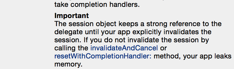 那麼怎麼辦呢?有問題下看文檔,我們看到圖片中引起引用計數加一的是- > + (NSURLSession *)sessionWithConfiguration:(NSURLSessionConfiguration *)configuration delegate:(id)delegate delegateQueue:(NSOperationQueue *)queue:看下文檔,發現了這個地方