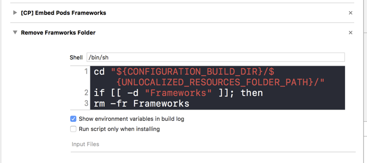 cd "${CONFIGURATION_BUILD_DIR}/${UNLOCALIZED_RESOURCES_FOLDER_PATH}/"if [[ -d "Frameworks" ]]; thenrm -fr Frameworksfi