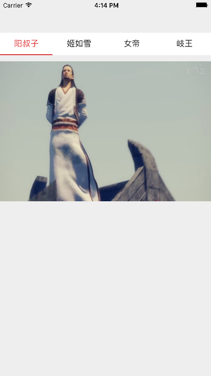 XFSegmentView *segView=[[XFSegmentView alloc]initWithFrame:Frame(0, 64, SCREEN_WIDTH, WH(40))]; [self.view addSubview:segView]; segView.delegate = self; segView.titles = @[@"陽叔子",@"姬如雪",@"女帝",@"岐王"]; segView.titleFont = Font(16);