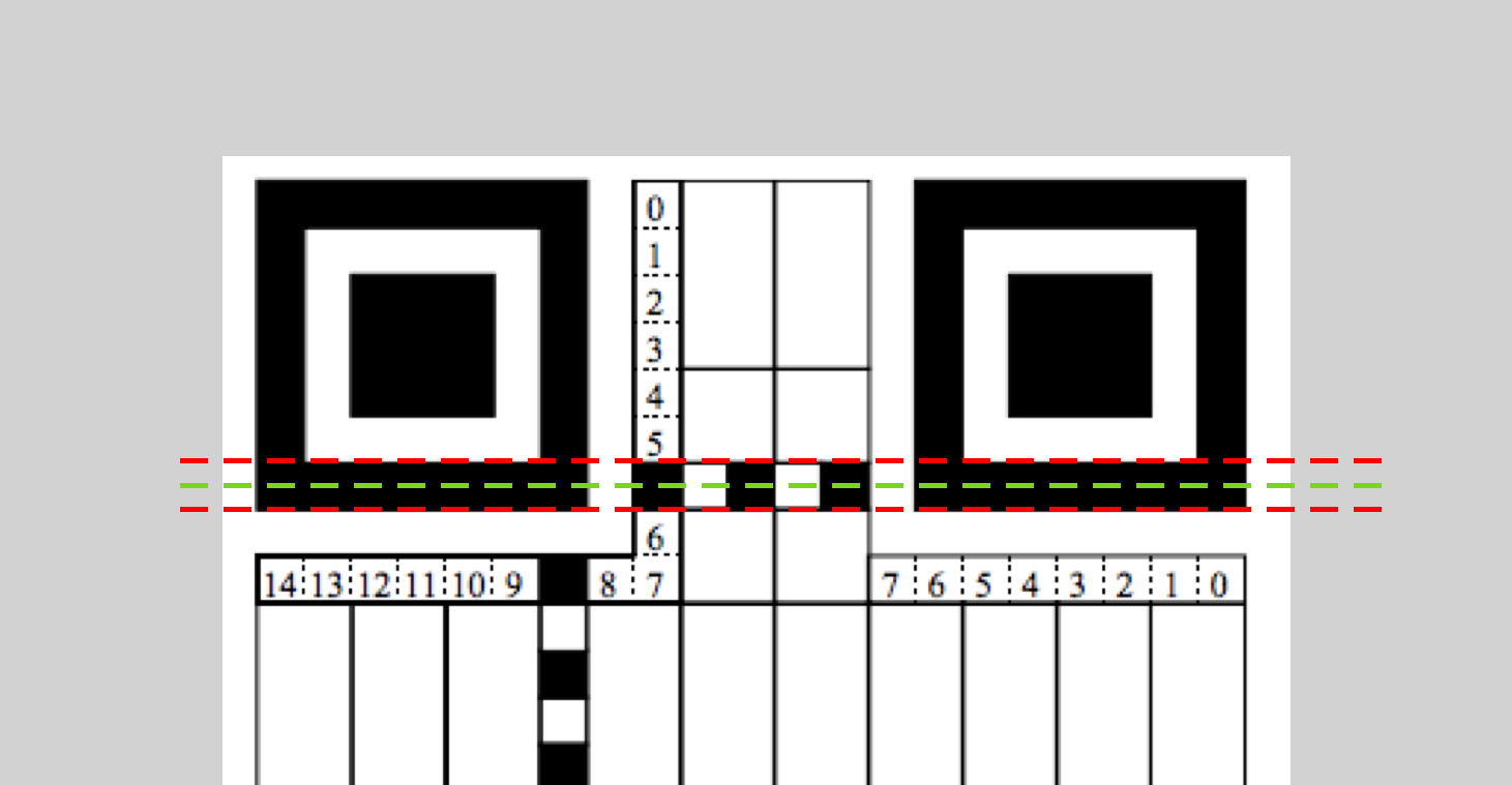像素序列拿到了,接下來就是判斷它是否是 Timing Pattern 了。 Timing Pattern 的特征是黑白均勻相間,所以每段同色區域的計數結果應該相同,而且旋轉拉伸平移都不會影響這個特征。