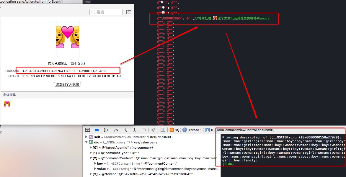 測試今天發來了bug,說是有的字符沒過濾掉。我看了一下的確,在iOS9.3開源的代碼中沒有添加進去一些新的emoji。而且值得注意的是:新增的emoji中竟然出現了新的[emoji語法]!!!新增了同性之間的emoji和家庭的emoji有著不同的語法!一個emoji可能有很多個編碼。