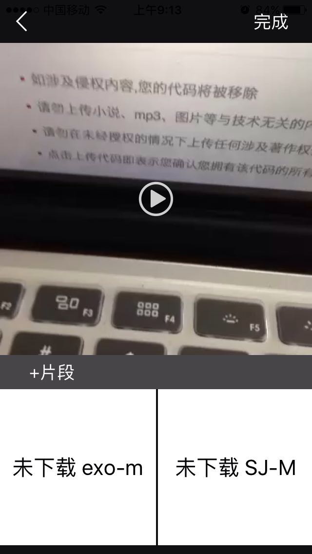 這是引用了@Pandara_Wen的SBVideoCaptureDemo,裡面仿照“微視”,錄制多段視頻,然後合並成一個正方形的視頻文件。用AVFoundation自定義界面的視頻錄制demo,我修復了多段小視頻合成崩潰的BUG,然後自己加了不同尺寸大小的視頻合成功能,以前沒事寫的demo,貌似還存在一點BUG,裡面引用了一個第三方開源框架,打的是真機包,必須真機才能測試