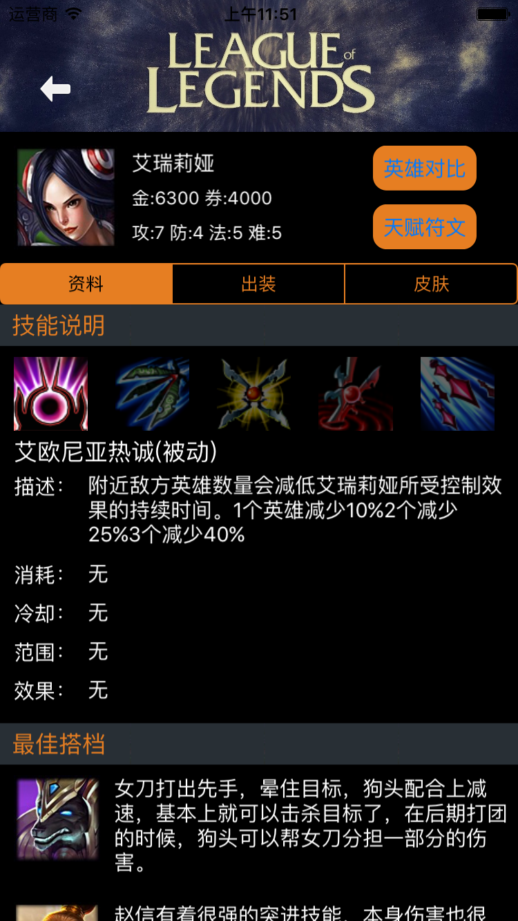 該應用主要做了英雄展示,裝備展示,游戲資料等,接口是從多玩飯盒抓的。可以綁定召喚師,使用了NSUserDefaults進行本地存儲。第一次做,若有不便之處敬請諒解。