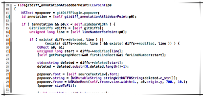 這個插件在企業級App的開發中,使用率非常高,效果非常好。 坐標文件列表中的M,D,A,A+,? 可以很快的顯示你有哪些文件修改了。 但是精確到文件裡 這個插件就能很好的展示,默認是新增的位置顯示綠色,修改的位置顯示紅色。 當然這些也都是可配置的。 (雖然xcode或終端也有很多方法能對比看diff但是沒有這樣簡單直觀)