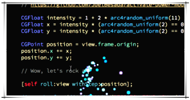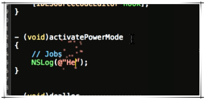 功能和上面的相似並且更狠,還帶響聲。但是讓xcode變卡的問題同樣存在。 而且這個插件比上面高端之處在於迸濺的火花的顏色和編輯位置的代碼顏色相同,作者找到了配色方案返回顏色的私有api得到代碼顏色。 迸濺效果更接近sublime上的效果。有人因為又用機械鍵盤 又帶響導致手被剁了,所以這個也慎入。