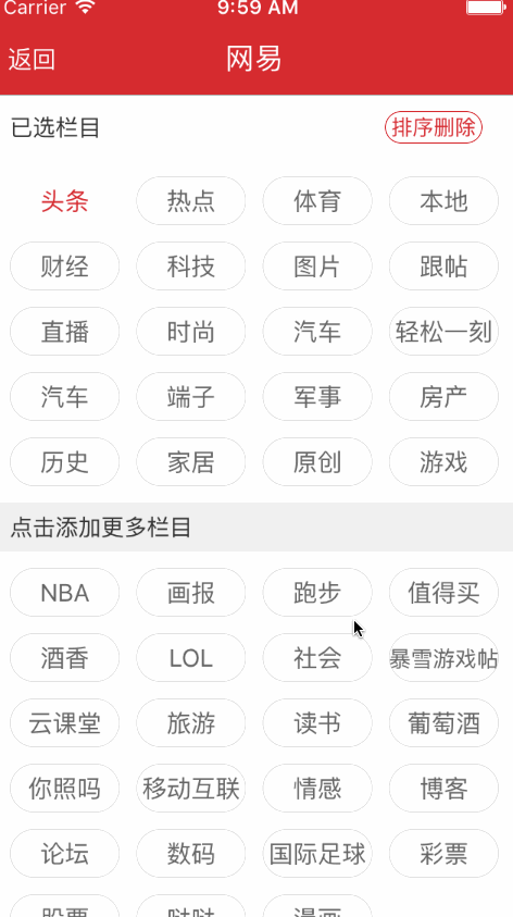 用純代碼實現網易標題欄目排序,刪除,增加的功能。