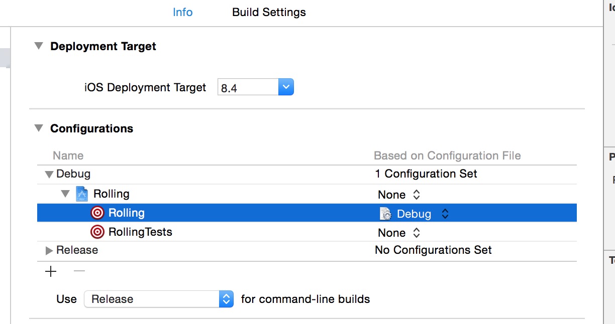 在項目中的Info類目下, 大家可以配置Configuration對應的選項的xcconfig, 通過xcconfig來配置Build Setting中的參數(見下圖)。