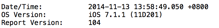 當程序運行Crash的時候,系統會把運行的最後時刻的運行信息記錄下來,存儲到一個文件中,也就是我們所說的Crash文件。iOS的Crash日志通常由以下6各部分組成。