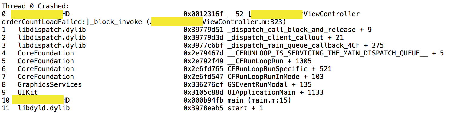 發生Crash的線程的Crash調用棧,從上到下分別代表調用順序,最上面的一個表示拋出異常的位置,依次往下可以看到API的調用順序。上圖的信息表明本次Crash出現xxxViewController的323行,出錯的函數調用為orderCountLoadFailed。