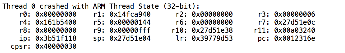 Crash日志記錄的時候是將Crash發生時刻,函數的調用棧,以及線程等信息寫入文件。一般都是直接寫的16進制地址,如果不經過符號化的話,基本上很難獲取到有用信息,下一篇我們將聊一聊Crash日志的符號化,通俗點講就是讓Crash日志變成我們可讀的格式。