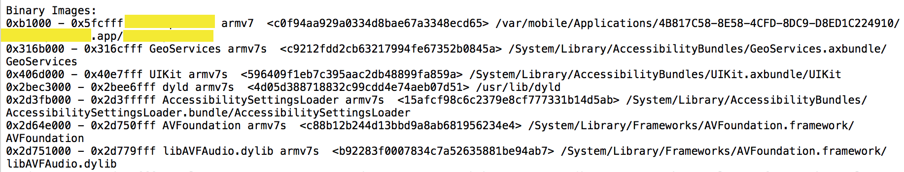 Crash時刻App加載的所有的庫,其中第一行是Crash發生時我們App可執行文件的信息,可以看出為armv7,可執行文件的包得uuid位c0f……cd65,解析Crash的時候dsym文件的uuid必須和這個一樣才能完成Crash的符號化解析。