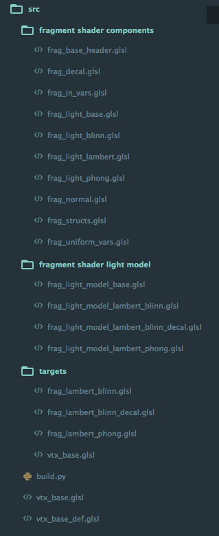 下面是我的一個GLSL程序結構目錄,我使用m4將這些復用代碼合並到一起。