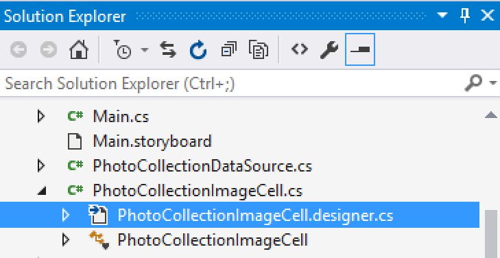 在解決方案管理器中,點擊 PhotoCollectionImageCell.cs 左邊的箭頭,展開它。打開 PhotoCollectionImageCell.designer.cs,你將看到 cellImageView 變量聲明。