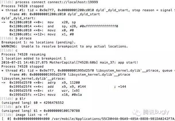最後再說說 lldb反調試,網上大多都提到 ptrace系列函數,原理我就不多說,這裡主要講如何繞過它,有兩種方法,先說第一種,直接通過匯編代碼修改 ptrace的第一個參數,這樣我們需要先知道在哪裡調用了 ptrace。