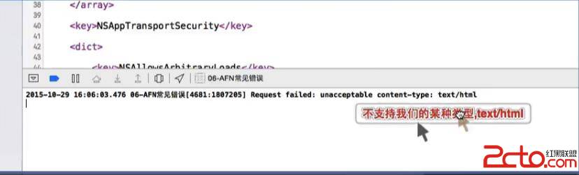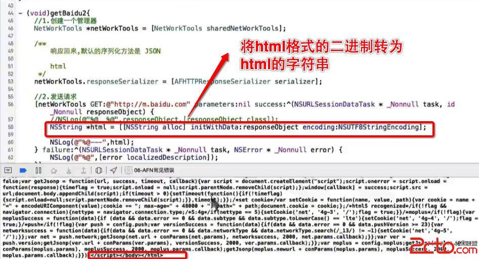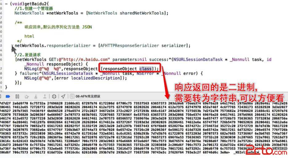 response響應,默認會把數據轉成JSON格式, 如果服務器返回的是JSON格式的還好, 如果 返回的是html, 字符串等等格式, 就不能用response的默認格式, 讓返回數據是什麼格式就呈現什麼格式, 但是二進制數據沒法看懂, 需要轉為了字符串, alloc,initWithData..