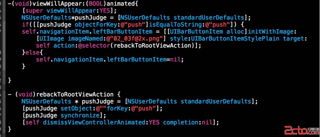下面介紹要跳轉的頁面MessageVC裡面要做什麼處理,其實裡面的代碼也很簡單。看代碼,在viewWillAppear裡面自行創建一個返回按鈕,根據在AppDelegate裡面用NSUserDefaults保存的字段做判斷。