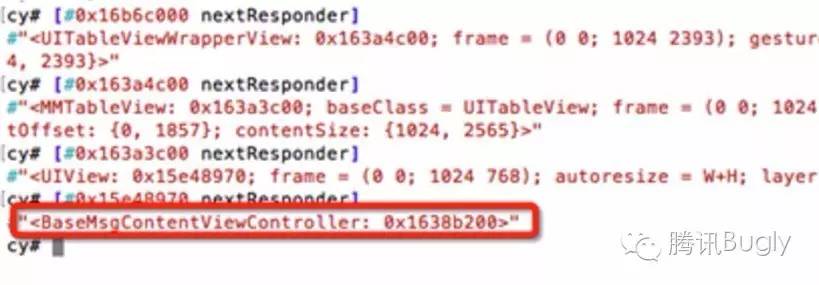 我們可以隨機的選取一個節點不要太靠樹葉,也不要太靠樹根,例如我選的是標紅的部分,把這個節點的內存地址copy出來,這個內存地址,就代表了這個節點的view對象,ios開發的老油條們都知道,通過view的nextResponder方法,可以找出它所屬的視圖控制器ViewController,所以我麼在cycript的控制台中持續輸入如下的命令: