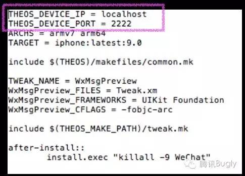 把上面logify生成的tweak文件覆蓋到當前目錄,並用文本編輯器打開makefile文件,在文件的開頭增加你的ios設備的ip地址和ssh端口:
