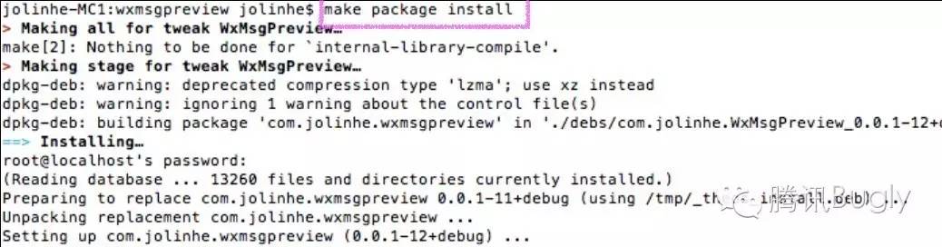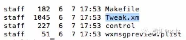 首先是bundle filter,這個需要填你需要注入的目標app的bundle id,MobileLoader模塊會根據它來尋找你的tweak的注入目標 最後是list id applications to terminate upon installation,這裡指定當tweak安裝成功之後,需要kill的進程,我們要hook微信,這裡就填微信的二進制文件名就可以了,為什麼要kill? 因為我麼的插件是需要在app啟動時加載進去的,如果不重啟app,插件是不會生效的最後一切都完成後,在當前目錄會生成下列文件:
