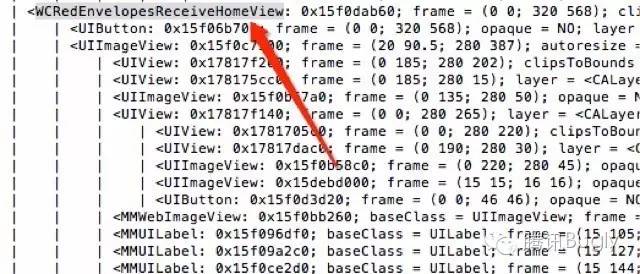 把紅包點開後,用cycript打印出當前view的層次,就像下面這個,一眼就可以看到重點,WCRedEnvelopesReceiveHomeView就是開紅包彈框的類名