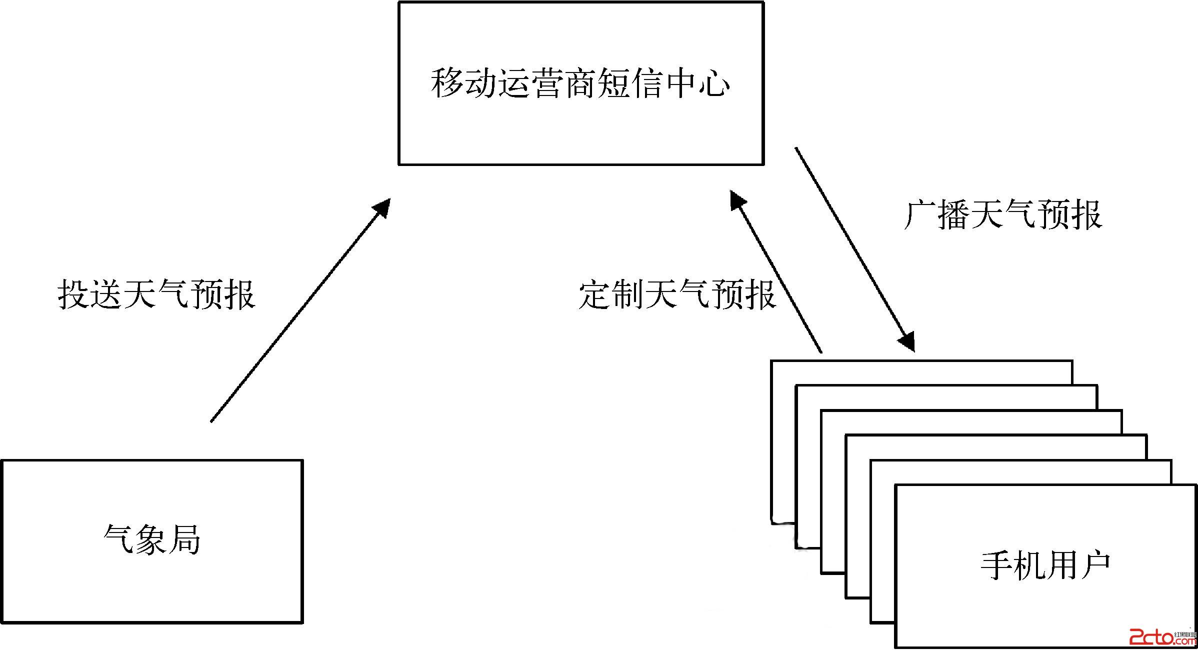 每天氣象局將天氣預報信息投送給移動運營商,移動運營商的短信中心負責把天氣預報發送給定制過這項服務的手機。
