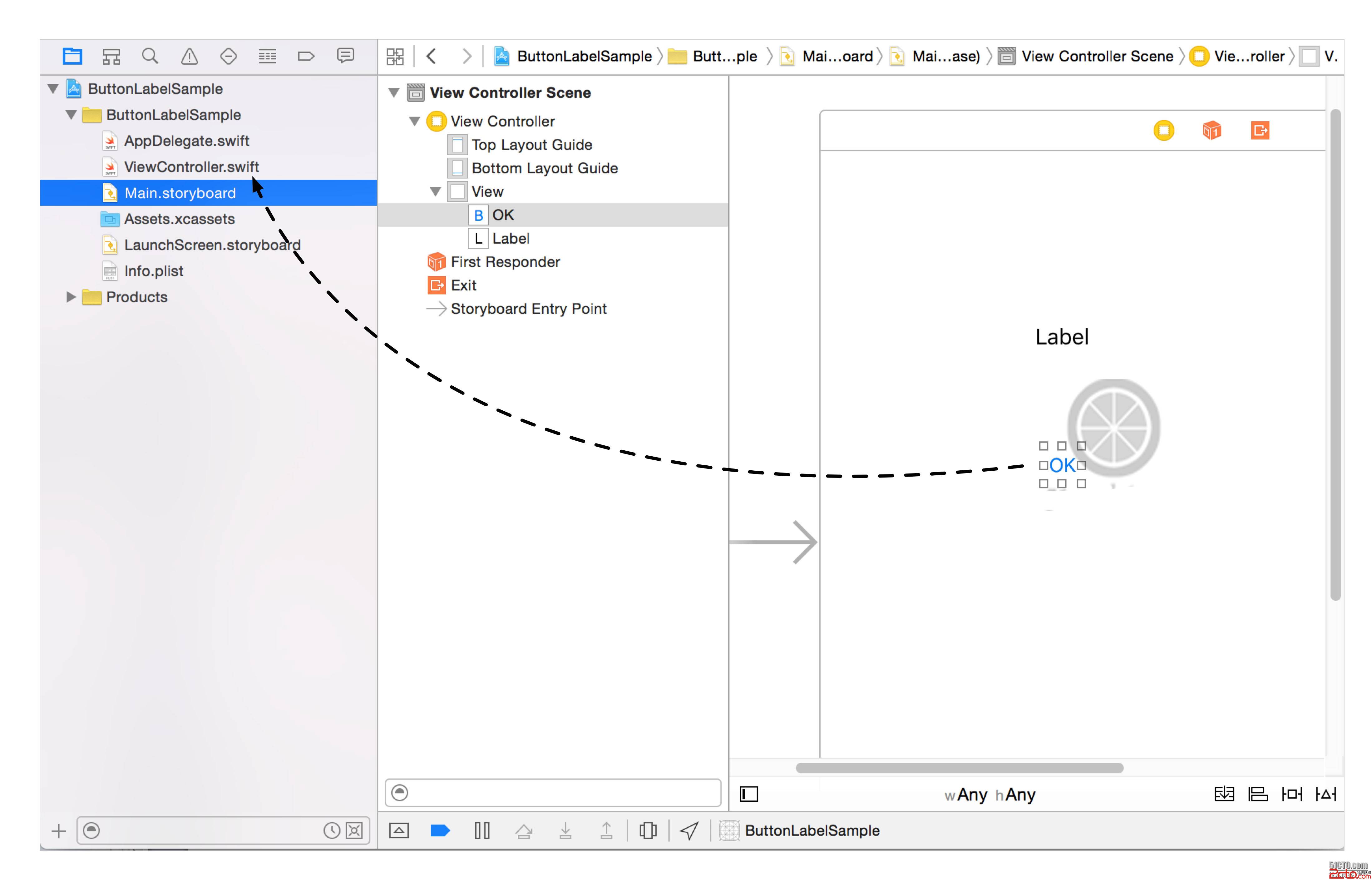 ButtonLabelSample案例首先要解決的問題是:按鈕點擊事件後有誰負責響應事件?誰進行事件處理?要答這個問題,可以打開ButtonLabelSample案例故事板文件Main.storyboard,如圖所示,OK按鈕是在故事板文件Main.storyboard定義的,響應事件以及處理事件應該是在程序代碼ViewController.swift實現的。那麼如何將OK按鈕點擊事件與ViewController.swift中的事件處理代碼關聯起來?不同的計算機語言實現的方式不同,在iOS和OS X應用開發中是通過目標和動作機制實現事件處理的。
