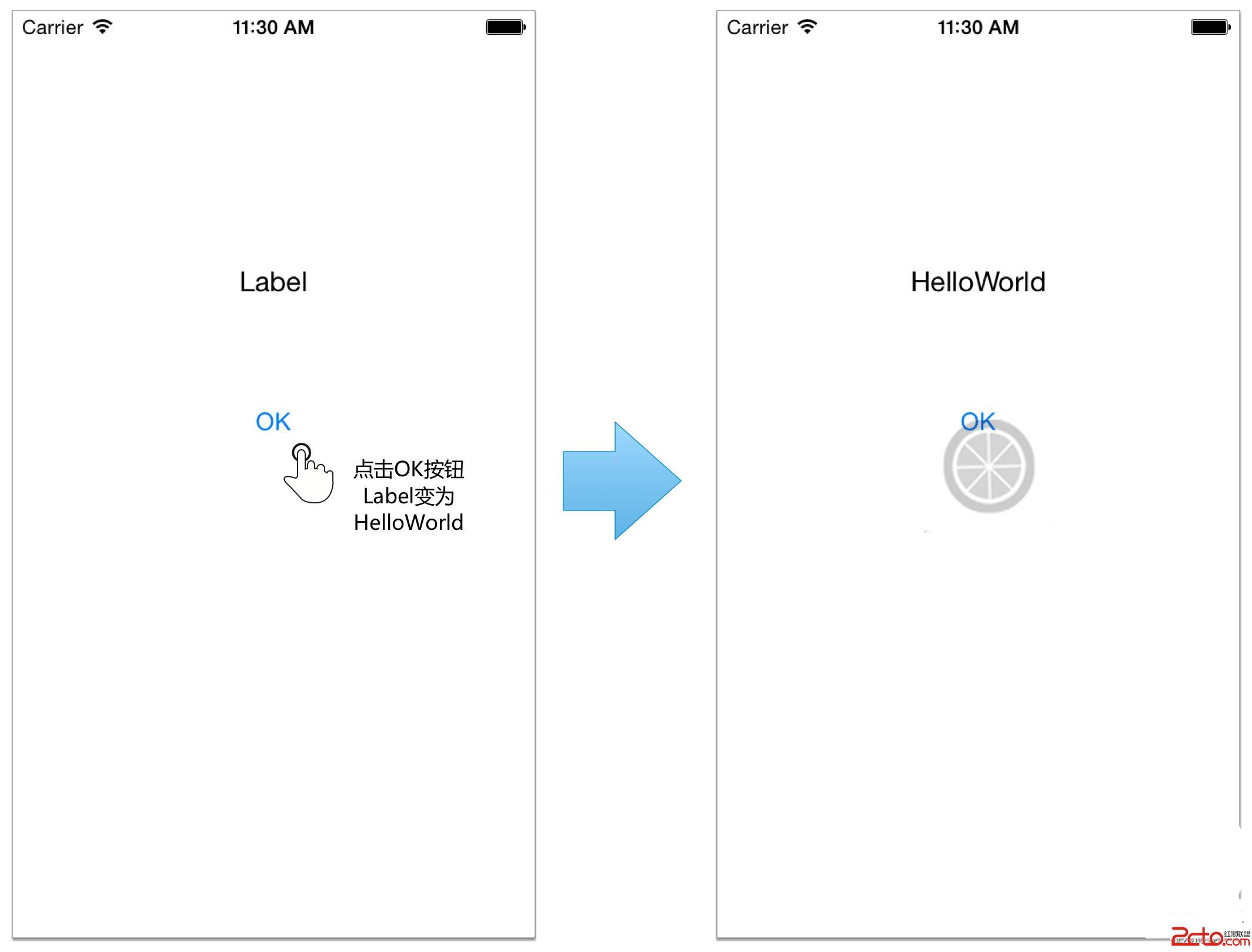 如圖所示是一個ButtonLabelSample案例設計原型圖,其中包含一個標簽和一個按鈕,當點擊按鈕的時候,標簽文本會從初始的Label替換為HelloWorld。
