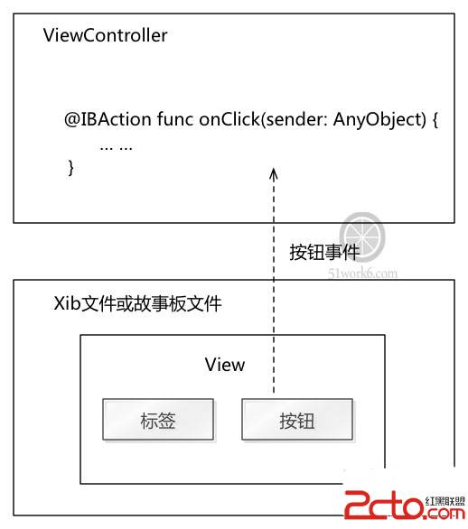代碼中是"onClick:",方法第三個參數是事件,TouchUpInside事件是按鈕的觸摸點擊事件。