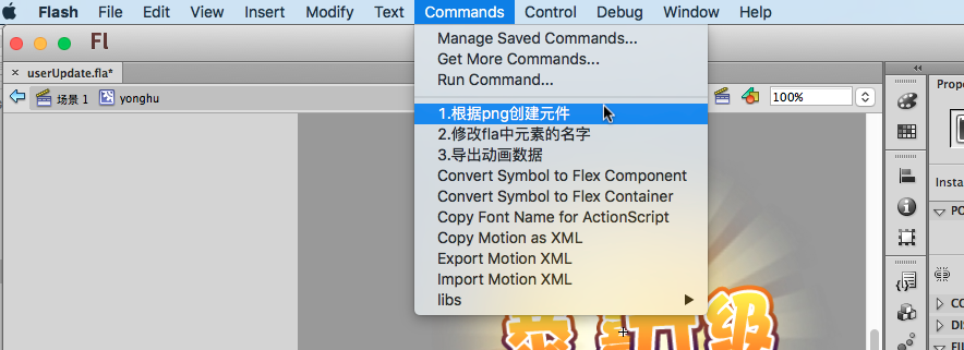 這時候打開flash,點擊菜單欄中的 Commands(中文的話應該是命令),在下拉菜單中就能看到我們加入的腳本啦。
