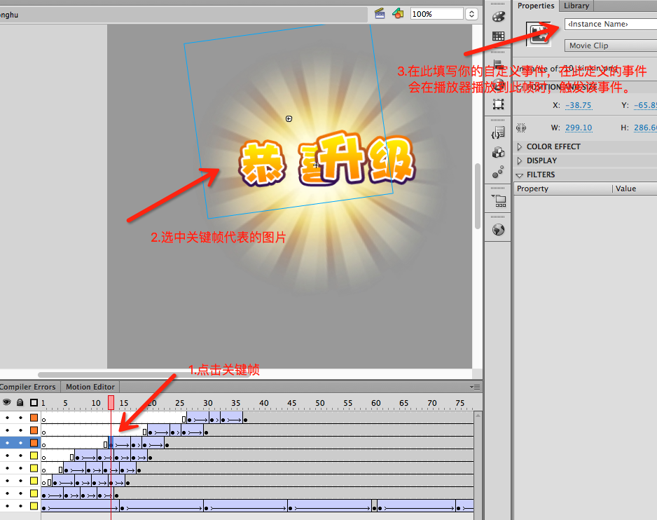 如果需要給關鍵幀添加事件,需要選中該關鍵幀(首先在timeline中選中關鍵幀,然後在主頁面中選中該幀代表的圖片,過程中最好隱藏timeline中的其它層),然後點擊右側與library同級的標簽頁properties。在第一行標有 < Instance Name > 的輸入框,輸入你的事件名,程序能夠在播放到這一幀的時候,觸發這個事件。