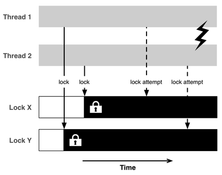 互斥鎖解決了競態條件的問題,但很不幸同時這也引入了一些其他問題,其中一個就是死鎖。當多個線程在相互等待著對方的結束時,就會發生死鎖,這時程序可能會被卡住。