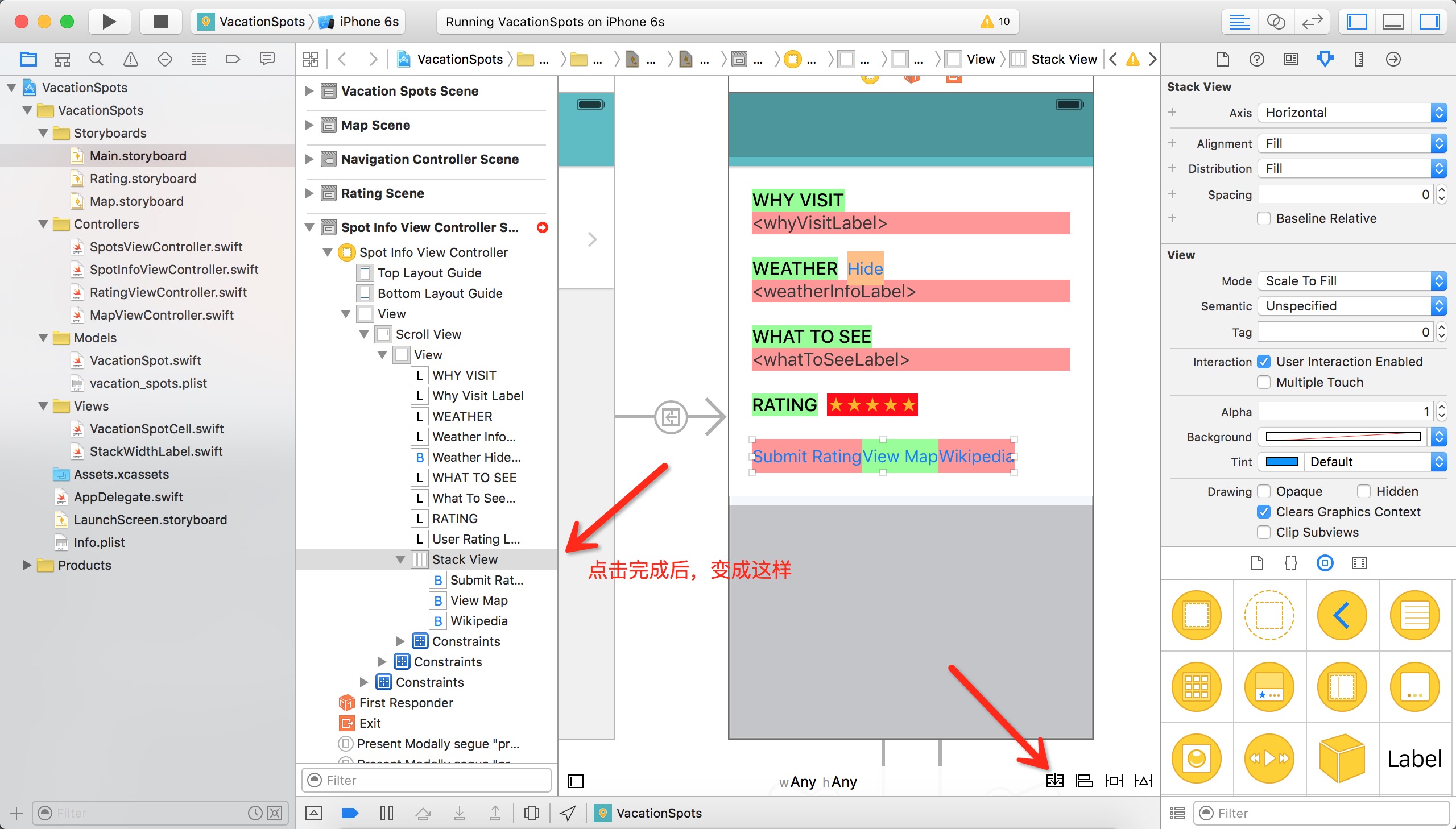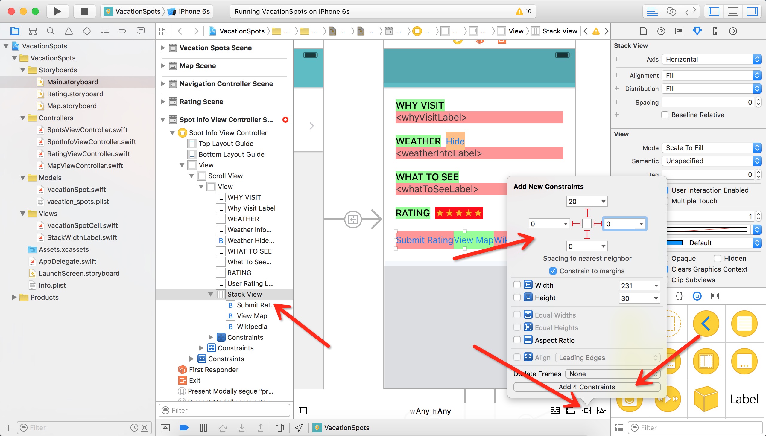 現在已經了解了這些問題,下面開始用UIStackView來修改這些問題。打開Main.storyboard,查看如下的Controller scene: