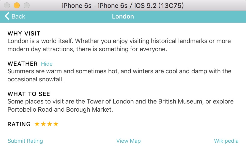 打開本章的配套的工程VacationSpots,在iPhone 6模擬器上運行,能夠看到APP有一些UI的問題,不要擔心,在後面將會修復這些問題。簡單梳理一下問題如下: