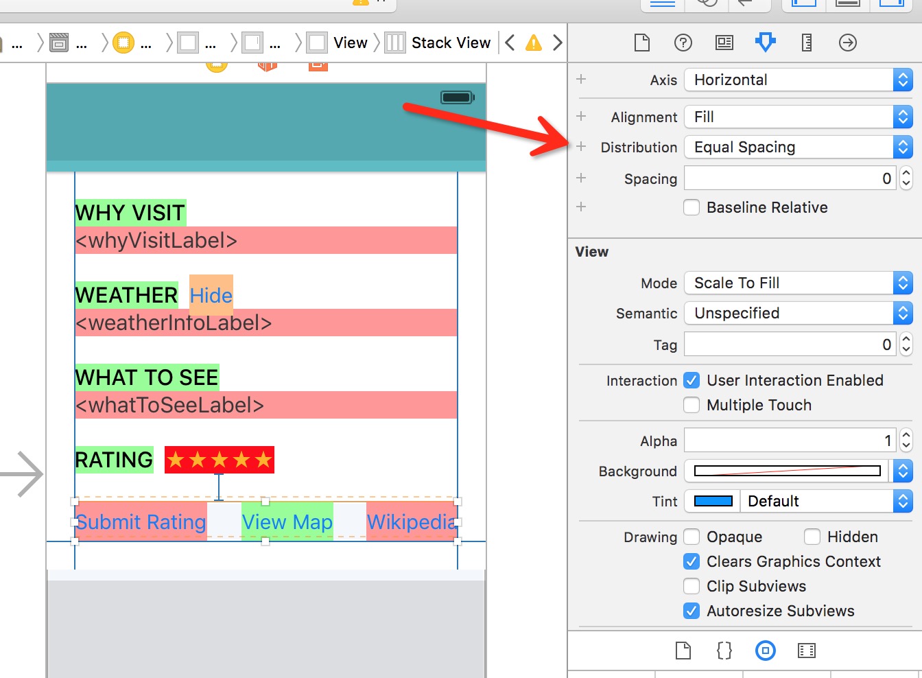 我們的目的是讓View間的距離相等,在Attributes inspector中修改Distribution為Equal Spacing。