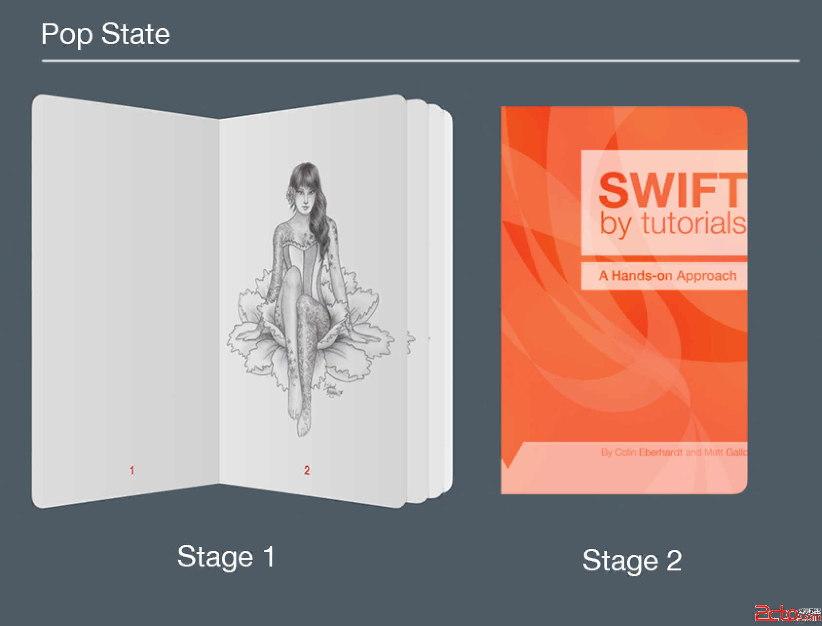 一個View Controller的Pop動作剛好和Push相反。狀態1是圖書打開的狀態,而狀態2則變成了書合起的狀態: