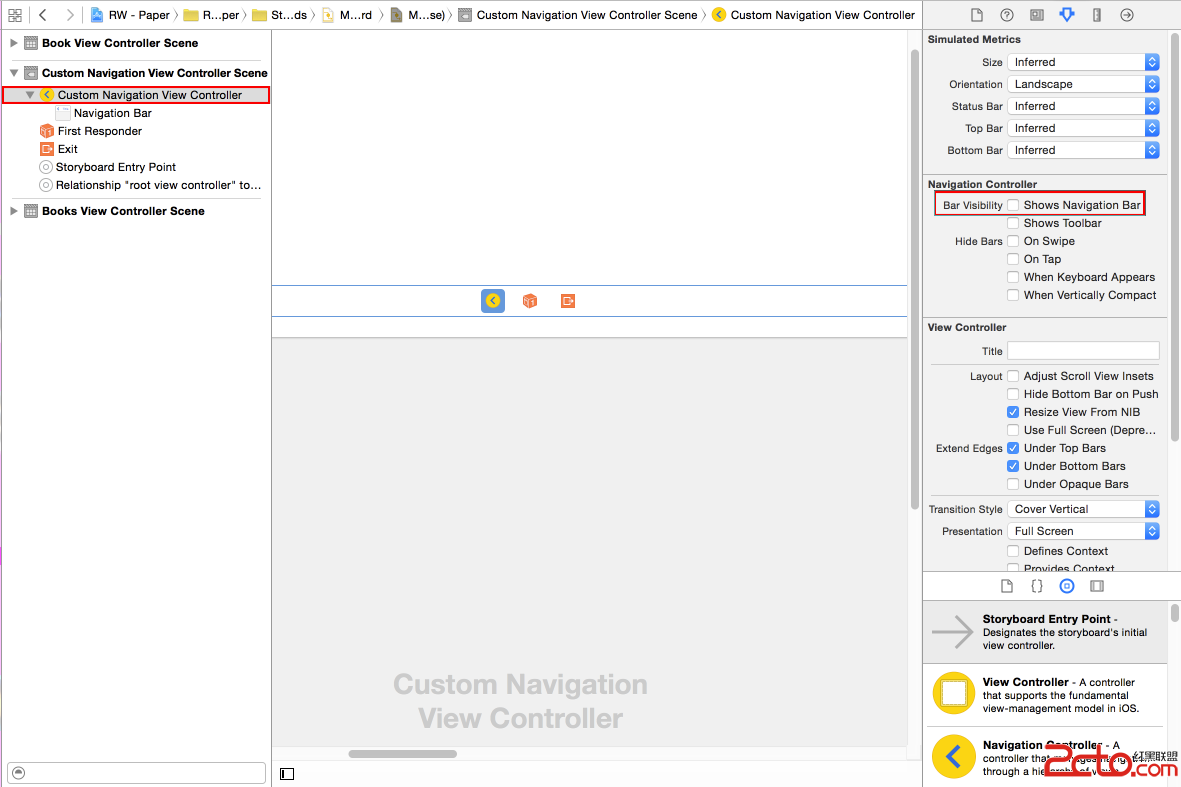 打開Main.storyboard,選擇Custom Navigation View Controller,打開屬性面板,在Navigation Controller一欄下面,取消Bar Visibility選項,如下所示: