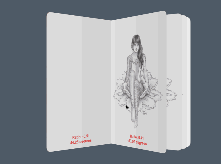 算出書頁的頁碼——記住,書是雙面的。 除以2就是你真正在翻讀的那一頁。 算出書頁的打開度。注意,這個值被我們加了一個權重。 書頁的打開度必須限制在-0.5到0.5之間。另外乘以0.1的作用,是為位了在頁與頁之間增加一條細縫,以表示它們是上下疊放在一起的。一旦我們計算出書頁的打開度,我們就可以將之轉變為旋轉的角度。